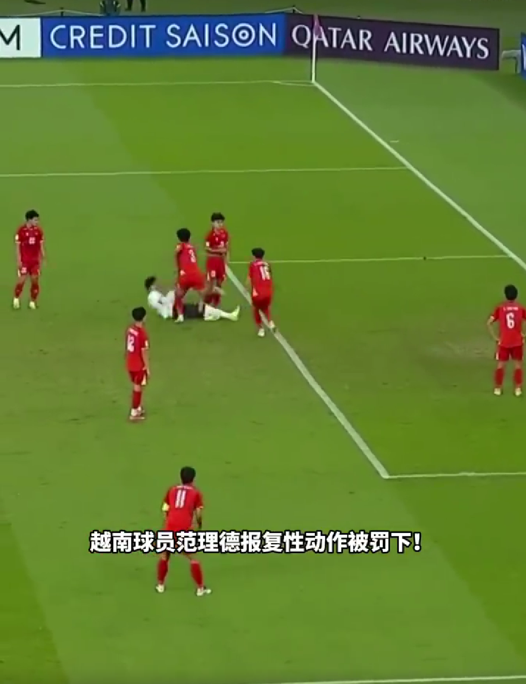 这场半决赛打到第74分钟,U23男足2-0领先越南队时,越南中卫范理德在一次无球状态下突然挥拳击打了正欲捡球快发的中国球员拜合拉木背部,